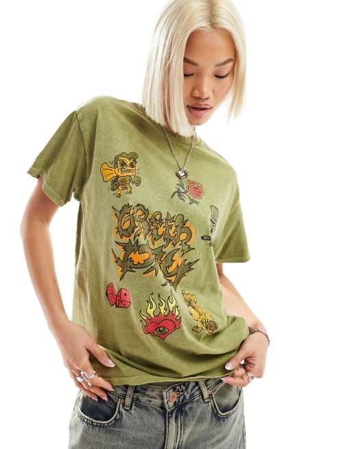 Daisy Street - Oversized T-shirt met Green Day-print in groene wassing