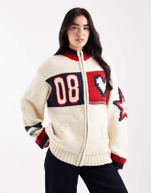 Daisy Street - Oversized vest met rits en sportieve grafische print in crème multi