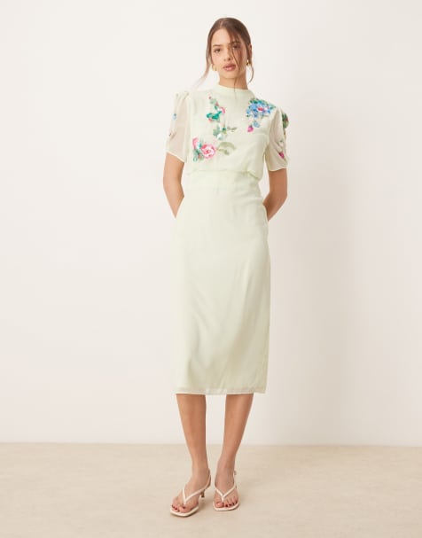 ASOS DESIGN - Satijnen midi jurk met hoge hals en gekruiste bandjes in chartreuse