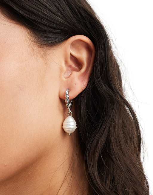 DesignB London - Gedraaide kleine oorringen met parelhangertje in zilver