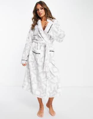 DKNY - Behaaglijke lange badjas met chenille motief en logoprint in grijs/wit