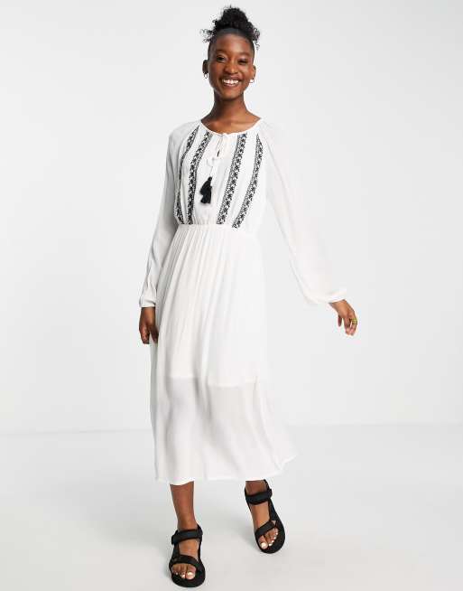 En Crème - Lange smockjurk met lange mouwen en geborduurd detail