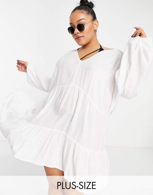 Esmee Plus - Exclusives - Aangerimpelde mini-zomerjurk met stroken en lange mouwen in wit