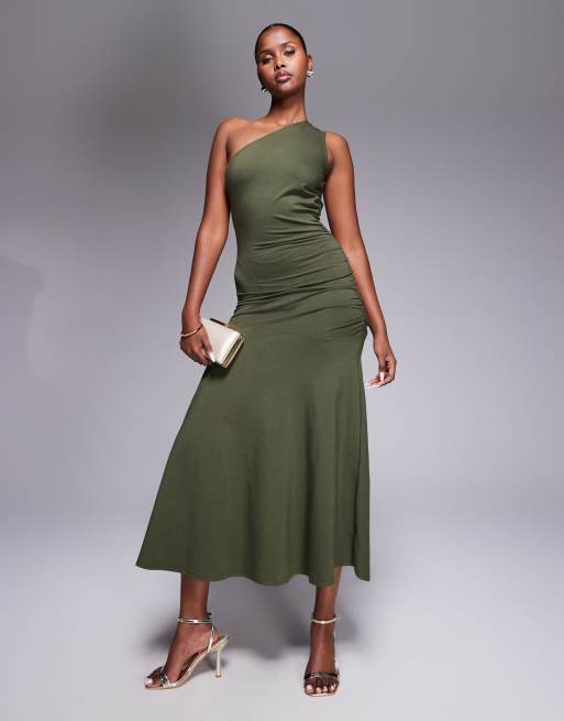 Fashionkilla - Gerimpelde maxi-jurk van katoen met blote schouder in kaki