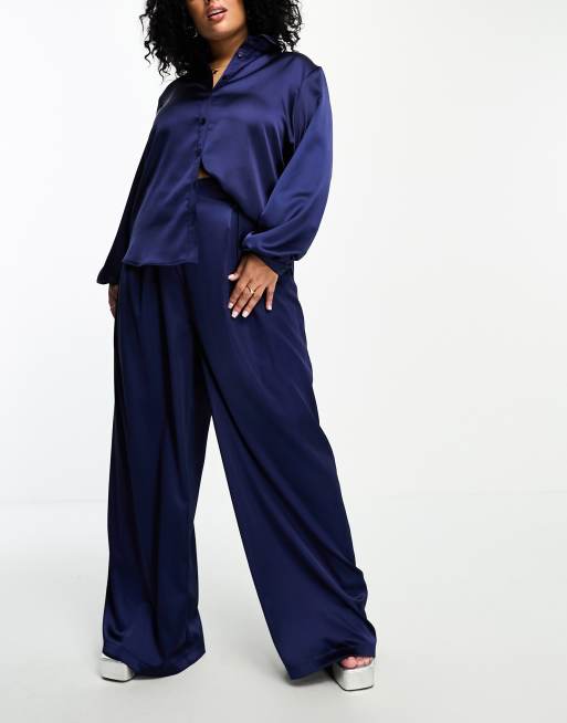 Flounce London Plus - Geplooide satijnen broek met wijde pijpen in marineblauw