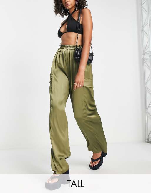 Flounce London Tall - Satijnen cargobroek met wijde pijpen in kaki