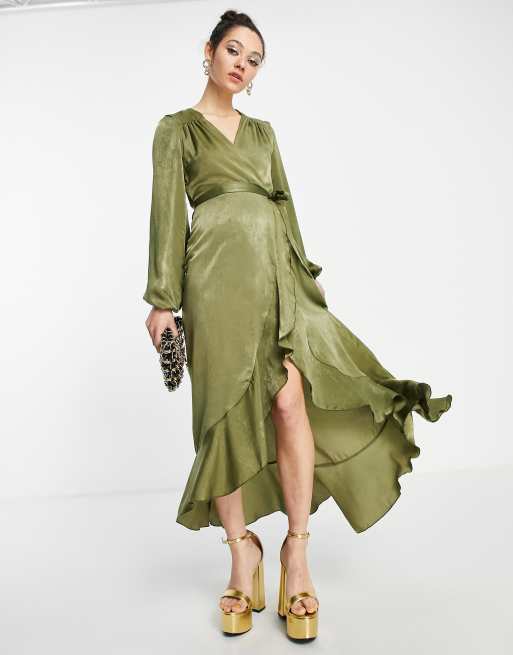 Flounce London - Satijnen maxi-wikkeljurk met lange mouwen in kaki