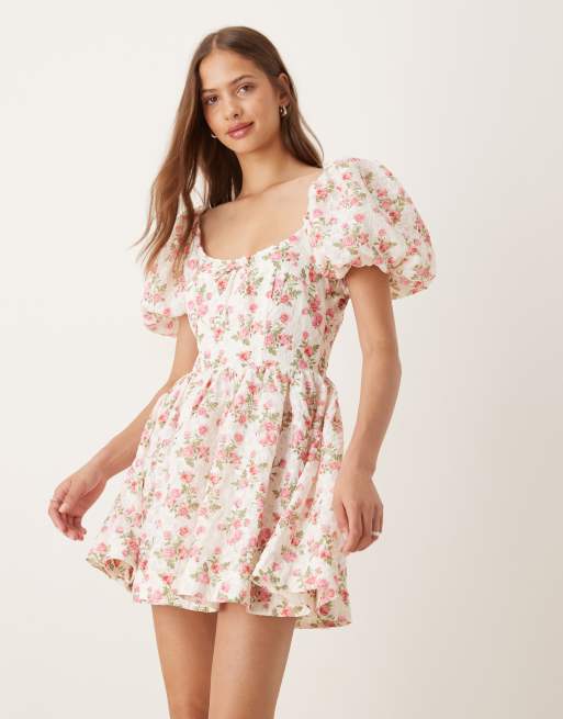 For Love & Lemons - Mini melkmeisjesjurk met pofmouwen in wit met bloemenprint