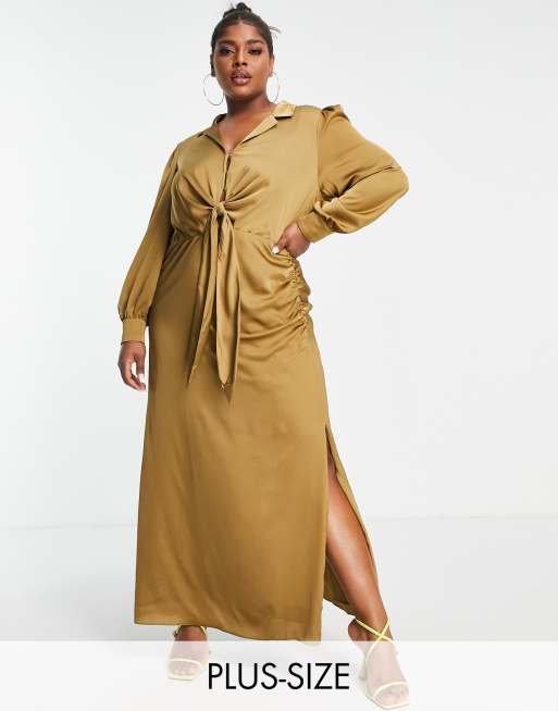Forever New Curve - Midi-overhemdjurk met gestrikte voorkant en rimpeleffect in olijfgroen