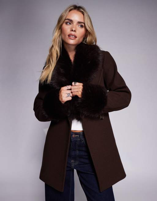 Forever New Petite - Korte jas met kraag en afneembare manchetten van imitatiebont in chocoladebruin
