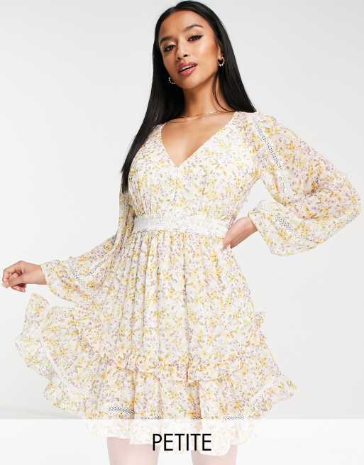 Forever New Petite - Mini-jurk met open achterkant en bloemenprint in geel met contrasterend kant