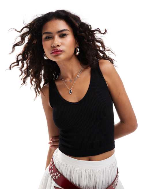 Free People - Brami - Geribbelde cami met lage ronde hals in zwart