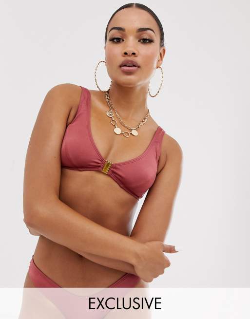 Free Society - Exclusieve hoogglanzende diepuitgesneden cropped bikinitop in roestbruin