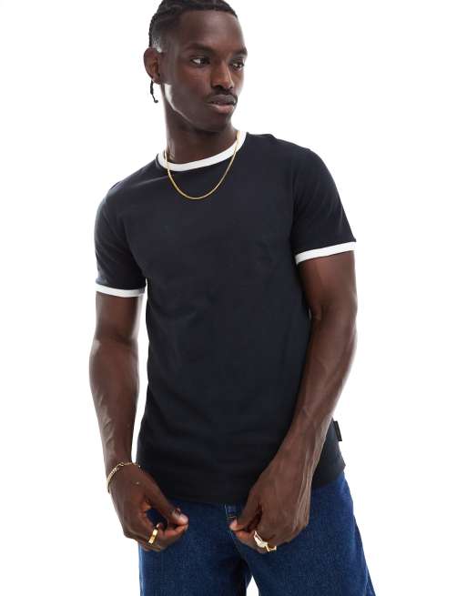 French Connection - T-shirt met textuur en gekleurde randen in marineblauw en wit