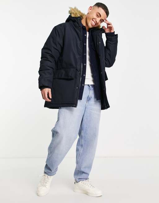 French Connection - Parka met capuchon van imitatiebont in marineblauw