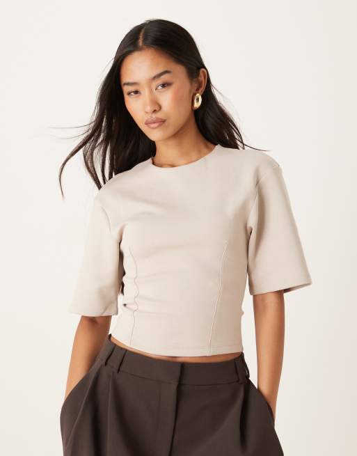 Gina Tricot - Gebreide top met korte wijde mouwen en aansluitende taille in lichtbeige