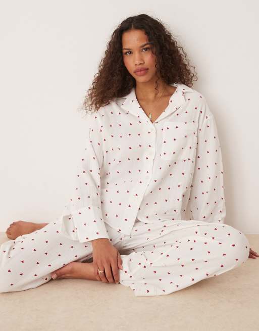 Gina Tricot - Mix en match - Pyjama van geweven gaas en flanel met rode hartjesprint in wit