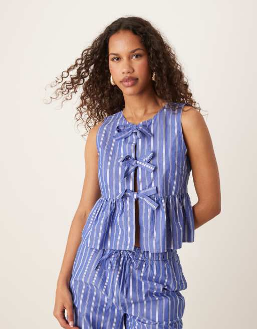 Stradivarius - Gestreepte mouwloze top met gestrikte voorkant in blauwe strepen, deel van co-ord set