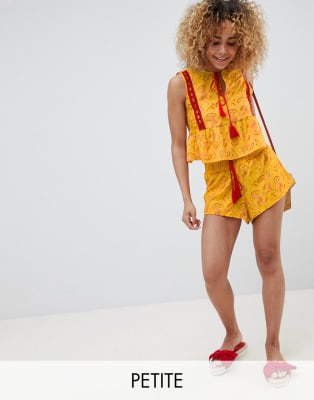 Glamorous Petite - Combi-set van folklore top en short met bandjes voorzien van kwastjes in patchworkprint