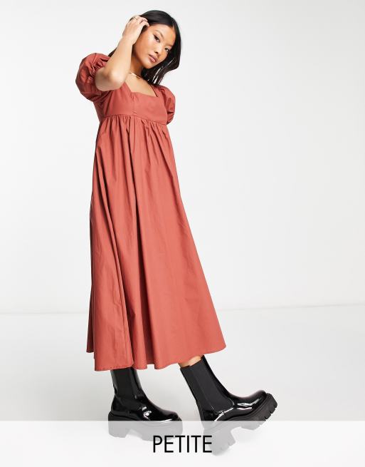 Glamorous Petite - Midi-smockjurk met vierkante hals en pofmouwen in roestbruin