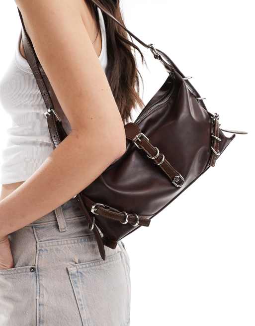 Glamorous - Grote schoudertas met gespdetail in bruin met wassing