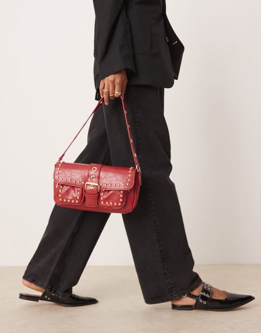 Glamorous - Jaren 90 schoudertas met studs en voorvakken in bordeauxrood