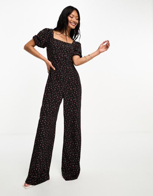 Glamorous - Melkmeisjesjumpsuit met wijde pijpen en gestrikte achterkant in zwart met rozenknopjes