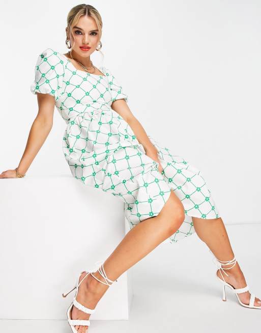 Glamorous - Midi smockjurk met vierkante hals in groen geruit bloemenpatroon