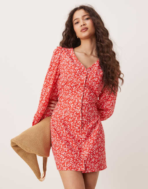 Glamorous - Nette jurk met lange mouwen en knoopsluiting in rood met fijne bloemenprint