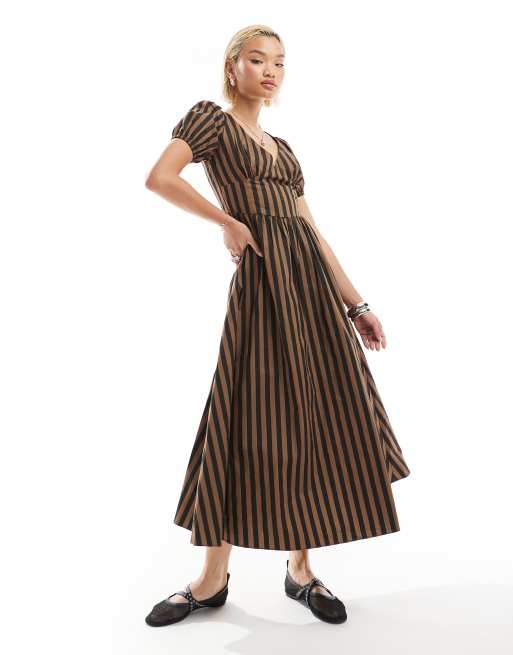Glamoureuze - Romantische maxi-jurk met V-hals en pofmouwen in chocoladezwarte streep