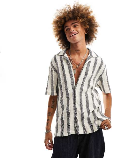 Guess Originals - Opengebreid overhemd met korte mouwen in wit/zwart gestreept