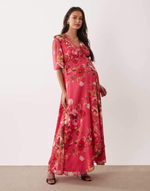 Hope & Ivy - Zwangerschapskleding - Maxi-jurk met fladdermouwen, overslag en bloemenprint in roze