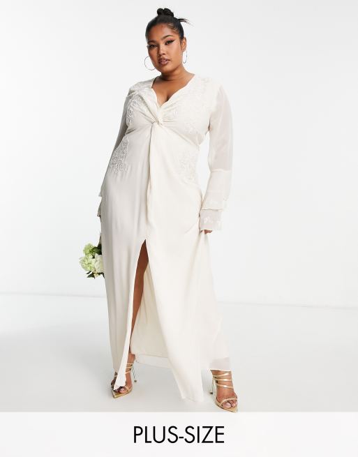 Hope & Ivy Plus - Bruidskleding - Lange jurk met gelaagde mouwen en borduursels in ivoorwit