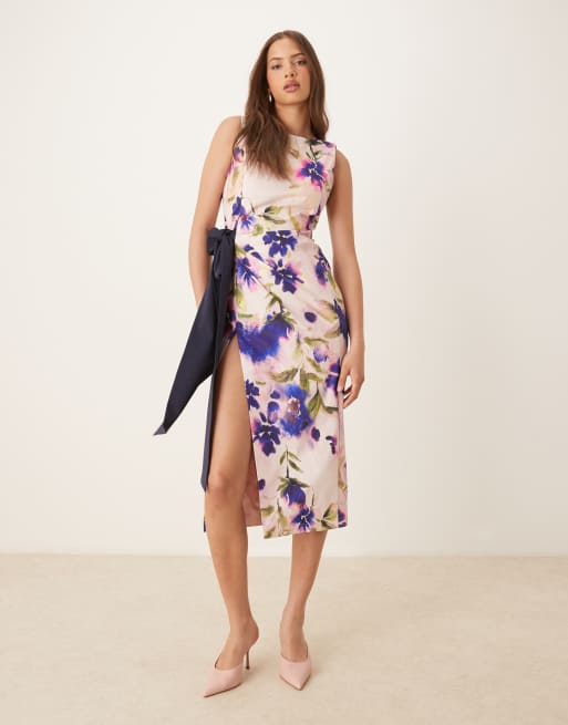 Hope & Ivy - Asymmetrische kokerjurk met strikdetail in paarse bloemenprint