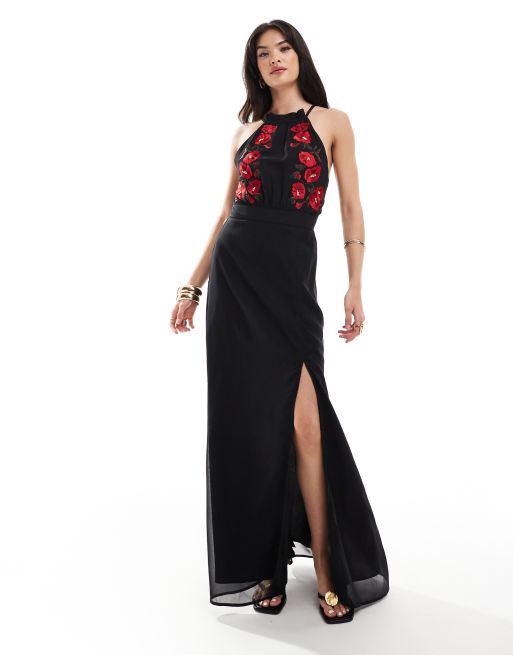 Hope & Ivy - Hoogsluitende geborduurde maxi jurk met split in zwart