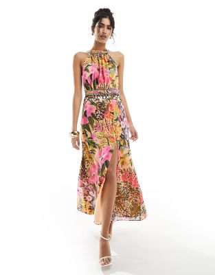 Hope & Ivy - Hoogsluitende maxi-jurk met dijsplit in kaki bloemenprint