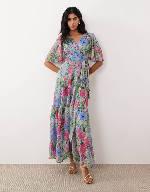 Hope & Ivy - Maxi jurk met fladdermouwen, overslagrok en gestrikte taille in lila bloemenprint
