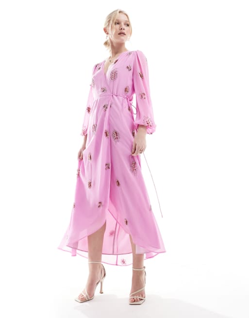Hope & Ivy - Wikkeljurk met versiering, gestrikte taille en blousonmouwen in roze