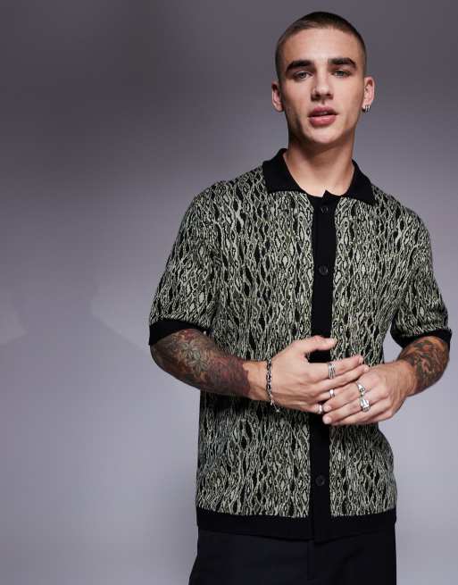 HUGO Red - Sgeo - Gebreide polo met slangenhuidpatroon, knoopsluiting en korte mouwen in lichtgroen