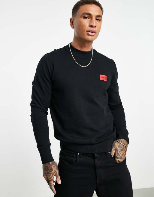 HUGO - San Raffael - Gebreide trui met opstaande boord en vierkant logo in zwart