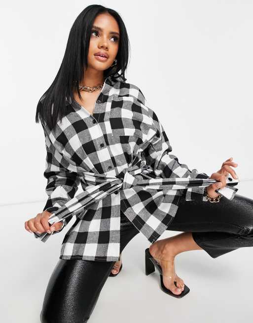 I Saw It First - Oversized geruit overhemd met geborstelde textuur en gestrikte taille in zwart