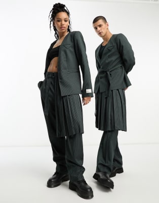 IIQUAL - Co-ord set van uniseks blazer met riem en broekrok in marineblauw en groene krijtstreep