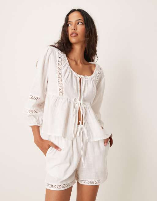 Iisla & Bird - Strandoverhemd met lange mouwen, gehaakt paneel en gestrikte voorkant in wit, deel van co-ord set