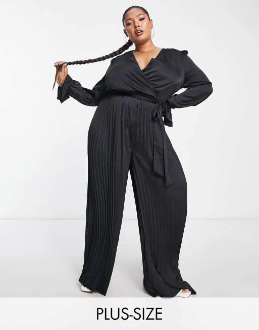 In The Style Plus - Exclusives - Geplooide, satijnen jumpsuit met wijde pijpen, overslag en riem in zwart