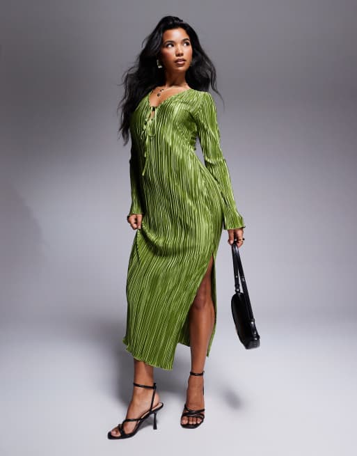 In The Style - Exclusives - Maxi jurk van plissé met gestrikte voorkant in kaki