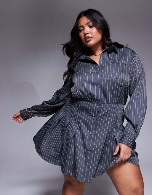 In The Style Plus x Natalya Wright - Exclusives - Elegante geplooide mini-overhemdjurk in antracietgrijs met krijtstreep