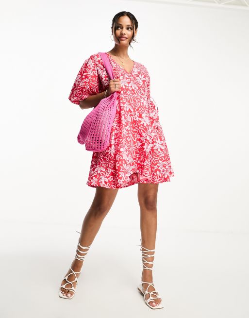 Influence - Mini jurk met overslag in rood met roze bloemenprint