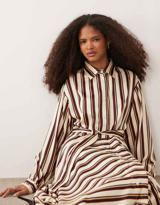 IYAL - Gestreepte maxi overhemdjurk van satijn met gestrikte taille in bruin