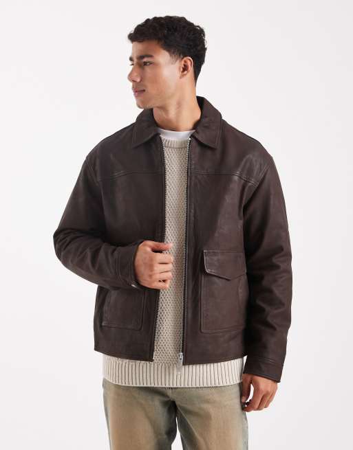 Jack & Jones - Leren Harrington jack met zakken in chocoladebruin