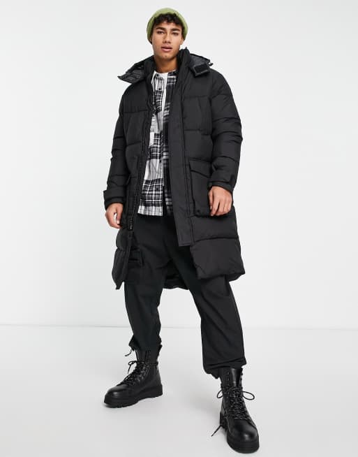 Jack & Jones - Originals - Lang, zwaar, gewatteerd jack met capuchon in zwart